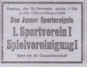 Der gestrige mit Spannung erwartete Lokalkampf zwischen dem 1.Sportv. Jena und der Spielvg. Jena brachte durch sein unentschiedenes Ergebnis eine große Ueberraschung . Trotz des überlegenen Spieles des Gaumeisters die Deckung der SpVgg doch stets ihr Tor rein zu halten . Nur ein kurz vor Spielende für den 1.Sportv. gegebener Hand-Elfmeter verhalf diesem zu dem unentschiedenen Ergebnis .