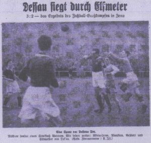Aus einer harmlosen Angelegenheit heraus fiel der erste Treffer für Dessau, als nach eine Flanke von Paul Niemann an die Latte köpfte und Schmeißer vollendete. Wenig später hatte Jena die Ausgleichschance, aber König placierte den verhängten Elfmeter schlecht, so daß Müllner zur Ecke abwehren konnte. Das Halbzeitergebnis von 1:0 entsprach etwa den Leistungen. Aber nach dem Seitenwechsel kam Jena weit mehr auf und es gab Minuten, wo Dessau sehr, sehr zu verteidigen hatte und nur selten über die Spielmitte kam. Es war aber erst ein Elfmeter, den Werner placiert einschoß, der zum 1:1 führte. Als einmal Jenas Verteidigung bei Kusmirek Hand reklamierte und nicht eingriff, lag Dessau wieder 2:1 vorn. Wieder erzielte König den Ausgleich. Bei diesem Tor wurde Müllner verletzt, er schied aus und Elze hütete das Tor. Zwei Minuten vor dem Abpfiff gab es erneut einen Elfmeter für Dessau. Ueber die Berechtigung läßt sich streiten. Jedenfalls aber nützte der Scharfschütze Paul die Gelegenheit aus. Gegen seinen unheimlich scharfen Schuß war kein Kraut gewachsen. Ecken 8:6 für Jena. Schade, daß der Kampf durch einen Elfmeter entschieden wurde - das war die Meinung der meisten Zuschauer. Und wir schließen uns ihr an.