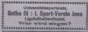 Sportverein Jena verliert gegen Gotha 1901 mit 0:1 . Gotha spielte zuerst mit dem Wind oder besser mit dem Sturm . Die Gäste liegen infolgedessen im Angriffe und in der Mitte der ersten Halbzeit kann Gotha bei einem der vielen Angriffe durch den halb linken Stürmer zu dem Tore kommen . In der ersten Halbzeit vermag der erste Sportverein gegen Gotha und den Wind nichts auszurichten . Die einzelnen Schüsse , die die Jenenser auf das Tor der Gäste geben , waren meist eine sichere Beute des ausgezeichneten Torwartes .
