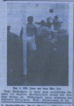 Fünf Tore donnerten die in großartiger Schußlaune befindlichen Stürmer des Neulings Halle 96 dem 1. Sportverein Jena in den Kasten, dem zweimaligen Mitte-Gaumeister, der erst vor wenigen Wochen um ein Haar den Schalkern in grandiosen Kampfe ein Unentschieden abgerungen hätte! Das war das Hauptereignis des heutigen Sonntags. Damit hat der Neuling seinen bisherigen Großtaten in den Punkte- Schlachten der Gauliga die Krone aufgesetzt. 55 Minuten lang vermochten die Werner-Elf den sich in Überform präsentierenden 96ern den Enderfolg streitig zu machen, dann war es um sie geschehen. Trotzdem Jenas Läuferreihe immer wieder versuchte, dem Schicksal eine Wendung zu geben, entschied der einwandfrei bessere Angriff der Leute von der Krosigkstraße nach dem Seitenwechsel das Spiel zugunsten der Platzherren, bei denen der Innensturm mit dem meist in rückwärtiger Position gewinnender Gabbert in noch nie dagewesener Verfassung war. Unermüdlich der schaffensfreudige Mitteläufer Lingesleben. Rudi Müller, wie oft in letzter Zeit, in der ersten halben Stunde nicht absolut ballsicher. Bei den Jenaern wurde der "berüchtigte" Bernhard wieder scharf abgedeckt, so daß er, besonders nach der Pause, nur selten gefährlich werden konnte. Alles in allem: Auf das weitere Abschneiden der 96er kann man nach dem heutigen großen Erfolge wirklich gespannt sein.