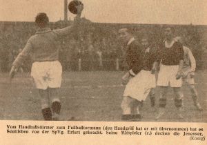 Als Rekordtorschütze ist König (1.SV Jena) bekannt, der in seinem früheren Wirkungsbereiche in der Tschechei im letzten Jahre die weitaus meisten Treffer erzielte. Wie wir schon berichteten, fand er sich bisher in den Jenaer Angriff noch nicht recht ein, er wirkte vor allem etwas langsam. Nun: die Jenaer sind seit dem Erfurter Spiel zufrieden, denn endlich hat König den Kontakt zu seinen Nebenmännern gefunden. Er legte ein Spiel hin, an dem man seine Freude hatte. Nicht nur in technischer Hinsicht zeigte er ausgezeichnetes Können, sondern er gab des öfteren auch Proben seiner Schußkraft. Im übrigen machte es sich beim Sportverein Jena bemerkbar, daß die letzten schweren Prüfungen (gegen Wiener SC und Spielvereinigung Fürth) die Mannschaft spielhärter gemacht haben. Sie sind wirklich nicht unnütz gewesen und die Mannen um Werner und den fleißigen Trainer Prokoph erwiesen sich als gute Schüler. Davon zeigten die Zeißstädter in Erfurt-Ilversgehofen auf der neuen Platzanlage der Spielvereinigung eine gute Kostprobe. Wohl gab sich die Spielvereinigung die erdenklichste Mühe das Resultat erträglich zu gestalten, sie wehrte sich mit allen Kräften. Aber die Überlegenheit der Jenaer, die von Werner meisterlich dirigiert wurden, war so markant, daß die Erfurter sehr oft in der Defensive stecken blieben. Gegen Jenas Spiel war kein Kraut gewachsen und hätte Senftleben nicht so aufopfernd im Tor gearbeitet, wer weiß...! Gegen die 5 wuchtig geschossenen Tore war er machtlos. Der Kampf war übrigens teilweise etwas rauh! Bertuch (Erfurt) erhielt in der Schlußviertelstunde Feldverweis, nachdem der Erfurter Eckart schon in der 40. Minute verletzt ausgeschieden war. Die zehn Erfurter hatten natürlich gegen die in feiner Form spielenden Gäste keine Aussichten mehr. Bei diesen führte sich der neue Linksaußen Hofmann (bisher 1.SV Gera) sehr gut ein.