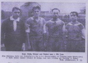 Der Erste Sportverein Jena, der Sieger in Erfurt war gleichfalls in ausgezeichneter Verfassung, wobei das Erfreulichste ist, daß der Halblinke König sich endlich akklimatisiert zu haben scheint. Er verstand sich mit der Neuerwerbung Jenas dem Linksaußen Hofmann (früher 1. SV Gera), der Soldat in Jena ist, tadellos und noch eines: König bewies die ihm nachgerühmte Schußkraft. Man darf also von ihm im Mitte-Pokalspiel gegen Württemberg Besonderes erwarten.