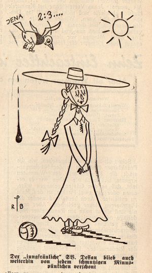 Es ist noch gar nicht lange her, als Dessau 05 das Vorspiel gegen den Ersten Sportverein Jena auf anhaltinischen Boden mit (sag und schreibe) 5:0 gewann! Das war den guten Thüringern doch etwas zu viel und nachdem nun ihr glänzender Siegeszug (in 9 Spielen hintereinander blieb Jena unbezwungen!), da bereitete man sich bestens vor auf eine Revanche für das 0:5 am Gaumeister. Diesmal sollte sie gelingen! Man hatte aber nicht mit den Dessauern gerechnet. "Wir werden bis zum Umfallen kämpfen, ehe wir Jena zu dem Triumph verhelfen, die erste Mannschaft zu sein, die uns schlagen wird!" So sagte man im Lager der 05er und - forderte 1.100 Eintrittskarten für den Jenaer Kampf an. Mit 9 großen Omnibussen und vielen, vielen Privatautos wurde die Fahrt gen Jena angetreten. Gewiß: eine Niederlage der Dessauer hätte in der 05er Rekordliste keinen "dunklen Punkt" bedeutet, aber es war den Anhaltinern bestimmt schon lieber, die diesjährigen Pflichtspiele ungeschlagen zu beenden. Der Wunsch der Dessauer wurde erfüllt. Auch Dessaus Trainer, unser Freund Hoeger, war überglücklich. Aber er war nicht zufrieden, wie er uns erklärte, denn seine Mannschaft lieferte wohl einen guten Kampf, aber nicht das erwartete große Spiel. Und Jenas Trainer Prokoph ist der Meinung, daß mindestens ein Unentschieden gerechter gewesen wäre. Hören wir in diesem Zusammenhange gleich, was der anwesende Gaufachwart Hädicke-Halle zum Spielausgang sagte: "Es war, alles in allem genommen, eine sehr interessante Auseinandersetzung zweier gleichwertiger Mannschaften. Verständlich war es, daß bei der Bedeutung des Kampfes das schöne und elegante Spiel stets dem Kampfmoment weichen mußte. Dessaus Elf erschien mir geschlossener und kampfkräftiger. Aber Jena war tatsächlich gleichwertig und hätte wohl ein Unentschieden verdient gehabt. Mich freut es, daß Dessaus Hegemonie, Deutschlands einzige ungeschlagene Gauligamannschaft zu sein, weiter bestehen bleibt. Dabei wurde es Dessau von den tapferen Jenensern gewiß nicht leicht gemacht." Der ähnlichen Meinung ist Gausportlehrer Tauchert: "Dessaus einheitlichere Mannschaftsleistung entschied den Kampf. Mir waren Krahls letzte 2 Elfmeterentscheidungen zu hart. Jena übertrieb die Kombination. Erst nach dem Wechsel trat hier Wandel ein. Es gab keine Klasse-Tore zu sehen. Als beste Spieler halte ich Hädicke, Hofmann, Werner und Beckert bei Jena, Müllner, Paul, Kusmirek und Weißenborn bei Dessau. Der Jenenser Ullrich war diesmal ein glatter Ausfall."