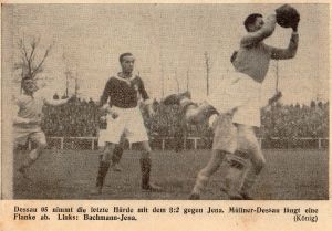 Aus einer harmlosen Angelegenheit heraus fiel der erste Treffer für Dessau, als nach eine Flanke von Paul Niemann an die Latte köpfte und Schmeißer vollendete. Wenig später hatte Jena die Ausgleichschance, aber König placierte den verhängten Elfmeter schlecht, so daß Müllner zur Ecke abwehren konnte. Das Halbzeitergebnis von 1:0 entsprach etwa den Leistungen. Aber nach dem Seitenwechsel kam Jena weit mehr auf und es gab Minuten, wo Dessau sehr, sehr zu verteidigen hatte und nur selten über die Spielmitte kam. Es war aber erst ein Elfmeter, den Werner placiert einschoß, der zum 1:1 führte. Als einmal Jenas Verteidigung bei Kusmirek Hand reklamierte und nicht eingriff, lag Dessau wieder 2:1 vorn. Wieder erzielte König den Ausgleich. Bei diesem Tor wurde Müllner verletzt, er schied aus und Elze hütete das Tor. Zwei Minuten vor dem Abpfiff gab es erneut einen Elfmeter für Dessau. Ueber die Berechtigung läßt sich streiten. Jedenfalls aber nützte der Scharfschütze Paul die Gelegenheit aus. Gegen seinen unheimlich scharfen Schuß war kein Kraut gewachsen. Ecken 8:6 für Jena. Schade, daß der Kampf durch einen Elfmeter entschieden wurde - das war die Meinung der meisten Zuschauer. Und wir schließen uns ihr an.