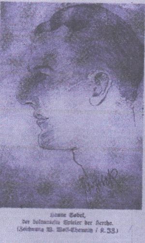 Der Jenaer Sportverein hat seit Jahren gerade gegen Berliner Mannschaften erfolgreich abgeschnitten. Man gab ihm auch in diesem Pokalspiel gute Chancen. Daß in Jena nur schwer zu gewinnen ist, wußte der Berliner Meister, der schon 1935 einmal nur knapp mit 1:0 gewonnen hatte. Diesmal war es nicht anders. Zugegeben, daß in der Gesamtheit die Reichshauptstädter eine Kleinigkeit besser waren, vor allem arbeiteten sie zügiger, so muß doch festgestellt werden, daß Jena in vieler Hinsicht gleichwertig war. Mittelläufer Werner hatte einen sehr guten Tag und stellte den Berliner Sturm, in dem nicht nur Hanne Sobeck, sondern auch Linksaußen Hahn fehlte, vor schwere Aufgaben. Uebrigens spielten die Berliner nicht nur gut, sondern sie waren auch kampfhärter als die Jenaer. Mittelstürmer Schulz hatte Hertha-BSC mit einem Kopfball in Führung gebracht, aber in der zweiten Halbzeit zog Jena gleich, als Bachmann eine gute Vorlage schön einköpfte. In der Schlußviertelstunde setzte Schneider II einen 35 m- Schuß aufs Jena- Tor. Der Ball war unbedingt haltbar, doch ließ ihn Göpfert passieren. Es war der Siegestreffer der Berliner die sichtlich aufatmeten, als der Schlußpfiff ertönte.